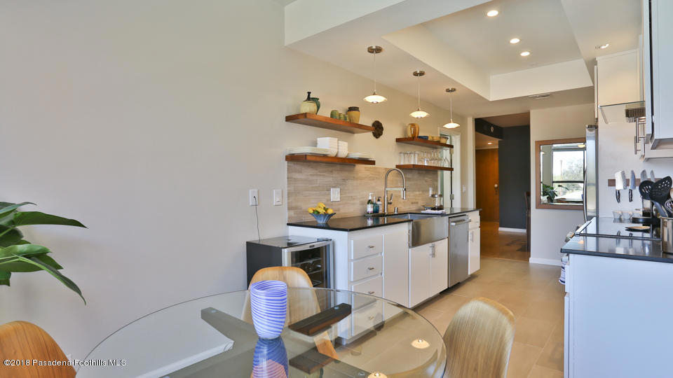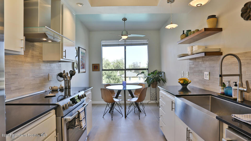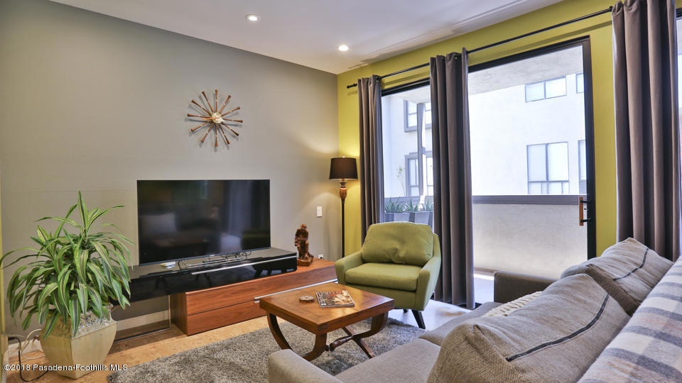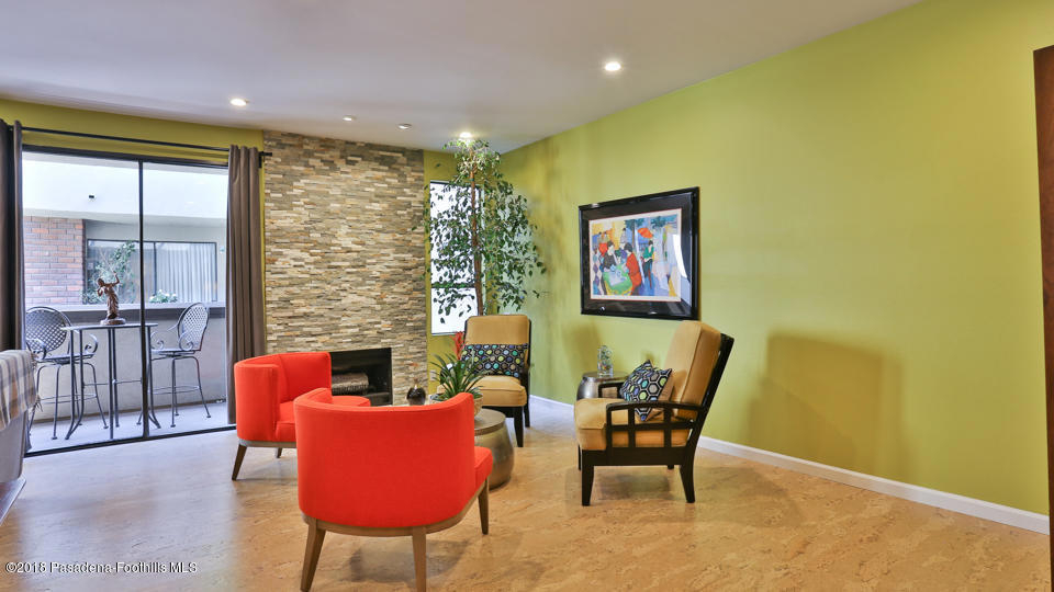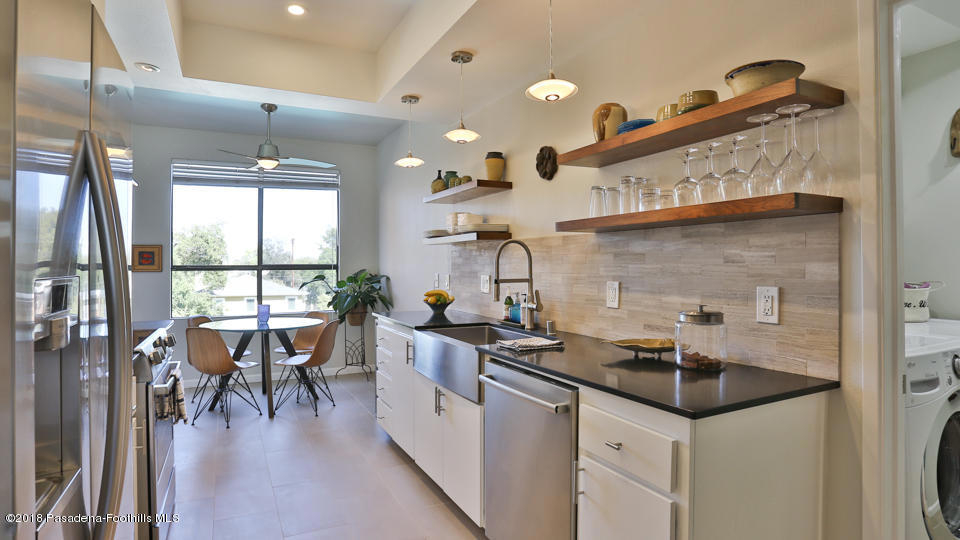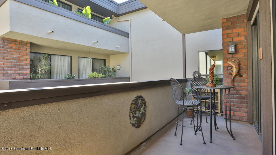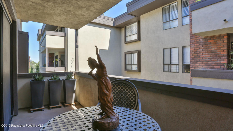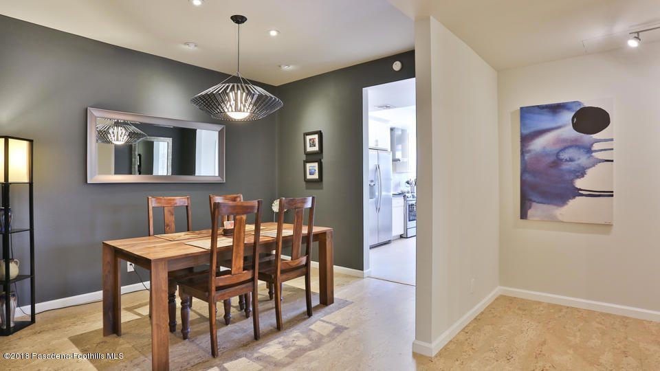 Located in the thriving South Lake district, this stunning residence is steps from some of the best dining and shopping in Pasadena. Ultra-chic appointments include elegant fireplace with marble hearth and stone facing, high ceilings with LED recessed lighting, durable cork flooring, and stylish custom colors throughout. The renovated kitchen offers sleek black quartz countertops, stainless steel Bosch appliances, floating open shelves made of walnut, and light-filled breakfast nook with east-facing window offering views to the pool. Both baths have been remodeled and feature glass tile and marble accents, vessel sinks, oversized glass shower with bench. The formal dining room is perfect for intimate dinners or larger-scale entertaining. Adjacent to the living room is a study area with working wet bar and glass shelving. Additional features include 1-year old central air system, private balcony, in-unit laundry room and walk-in closet in the owner's suite. The association pool and spa were recently renovated (spa to be completed soon). With a walk score rating of 81 and bike score of 90, this stylish condo is ideal for today's urban dweller.