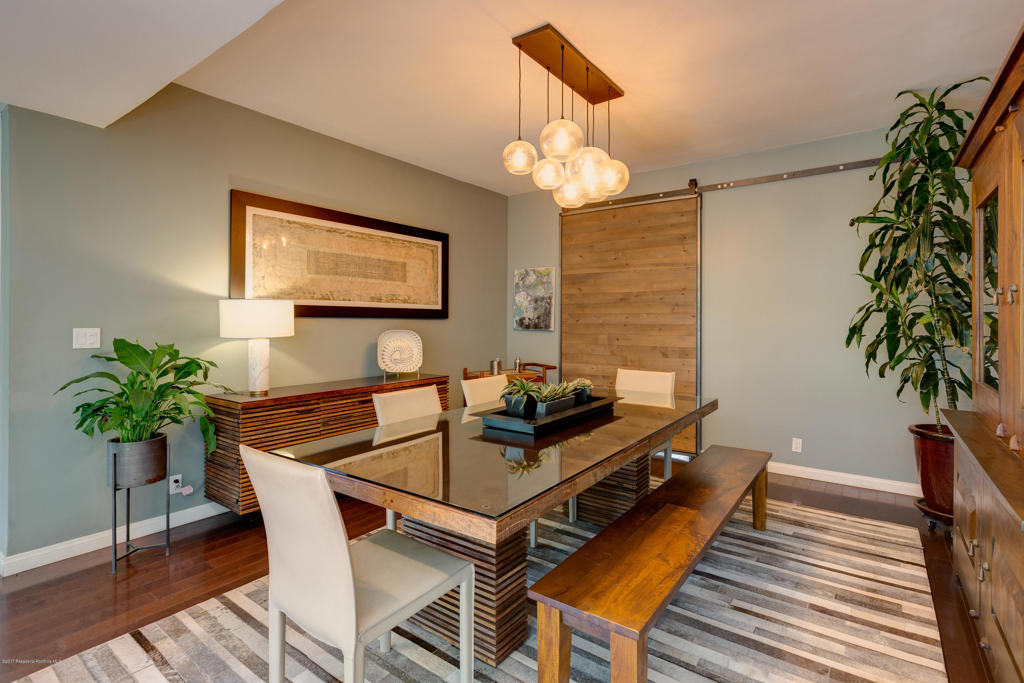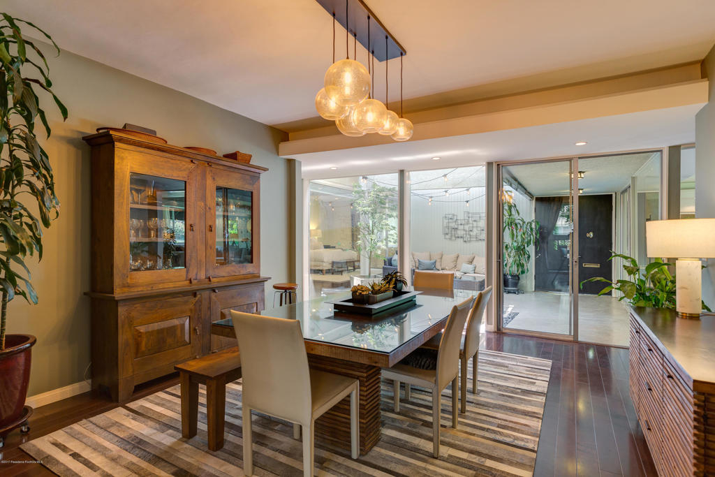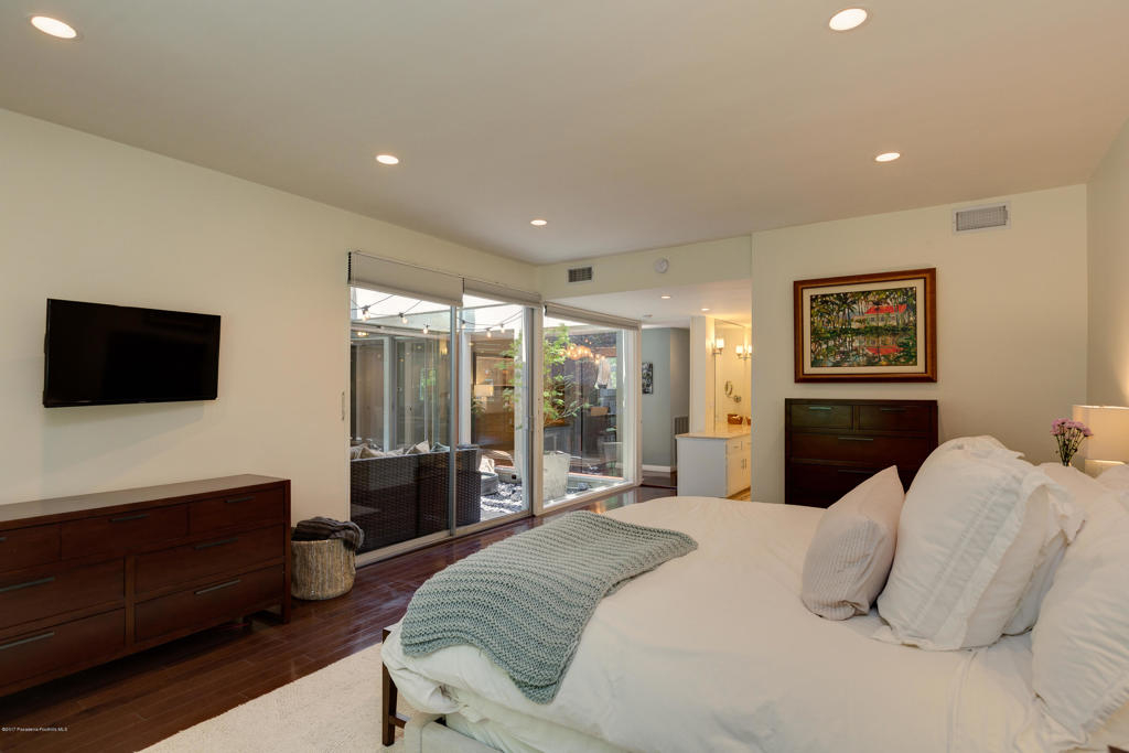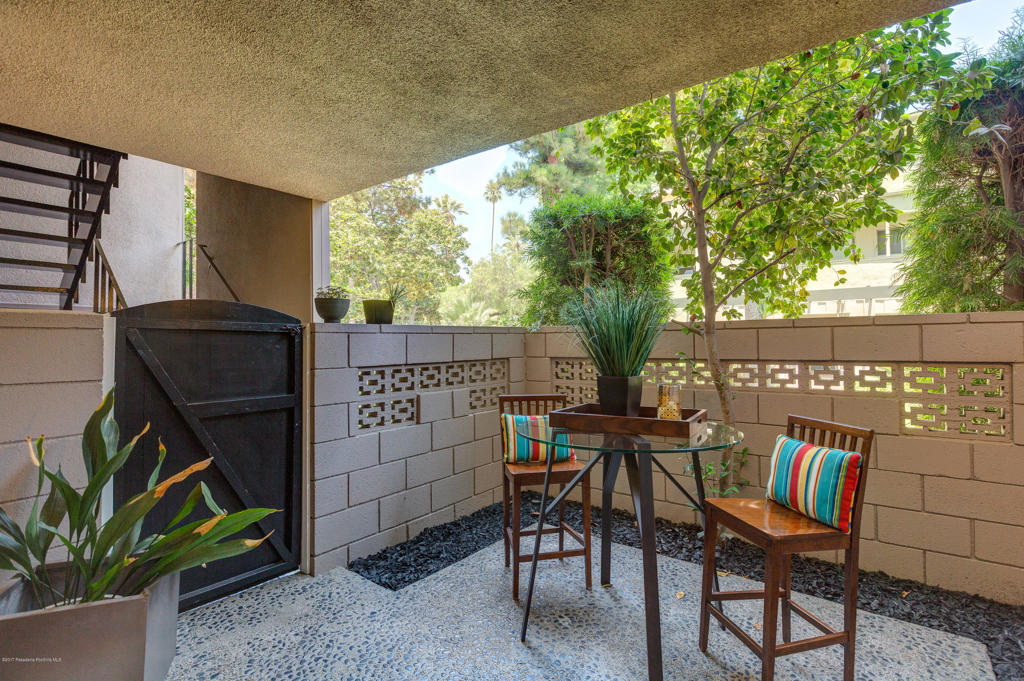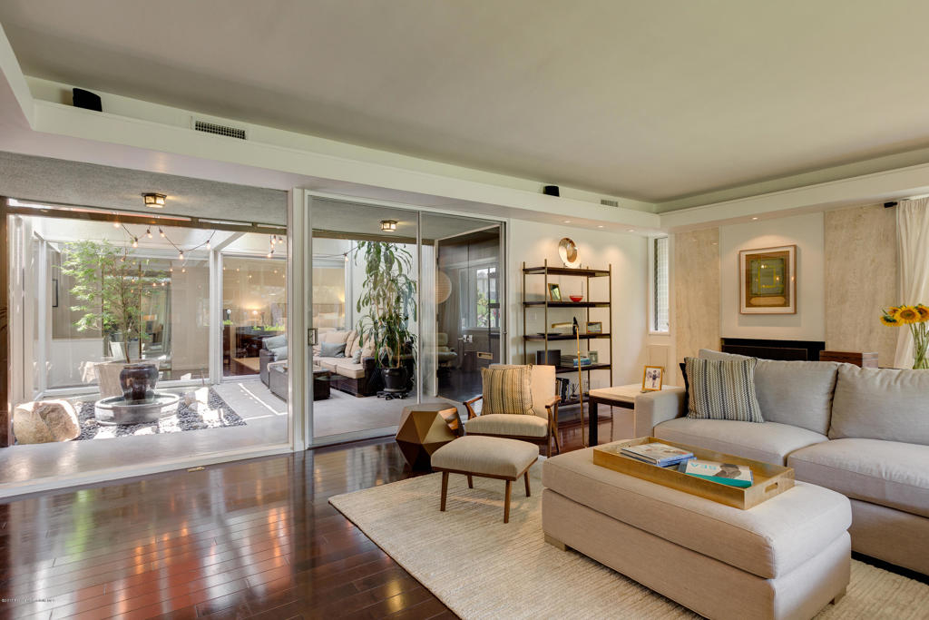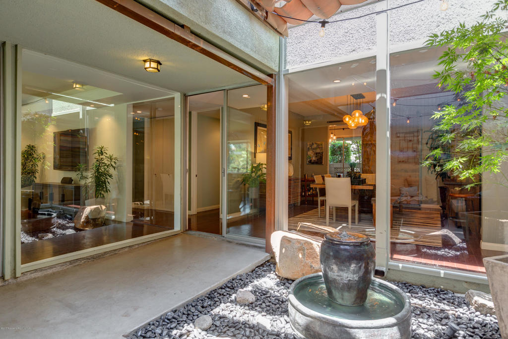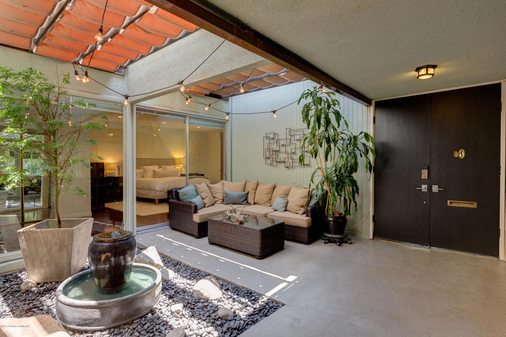 This stunning, mid-century condo boasts three bedrooms, three bathrooms, a double-door entry and an outdoor patio. With a water feature and open-air feel, the atrium off the entry is an entertainers dream and has access to the master suite, living room and dining room. In the spacious living room with a gas fireplace, windows fill the room with sunlight. Off the hallway is a bedroom suite with double sinks and a built-in wardrobe. The dining room is central to the home and features a spectacular barn door. The eat-in kitchen includes a Thermador Professional six-burner stove, Quartz countertops, a wine refrigerator, a farmhouse sink, loads of storage and a breakfast bar. A gorgeous master suite completes the unit with a spacious walk in closet, marble shower and vanityarea, and separate bath featuring marble countertops and shower. With its close proximity to wonderful Old Town Pasadena's restaurants, shopping, and fitness studios, and a short drive to Downtown Los Angeles, this beautiful home is situated in the ideal location.