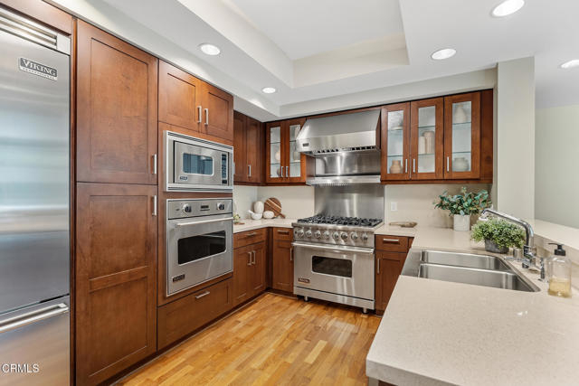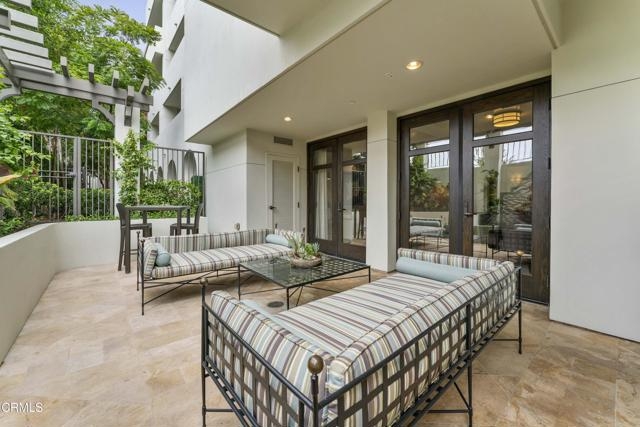 This elegant ground-floor end unit epitomizes luxury living within the esteemed Granite Park Place, Pasadena's premier concierge building. Designed for comfort and ease, the residence features a single-level layout with three private patios, creating the ambiance of a true haven while enjoying the advantages of full-service amenities. Upon entering, a welcoming entryway opens to the spacious great room, filled with natural light and complete with an inviting fireplace, dining area, and French doors leading to a private patio--ideal for seamless indoor/outdoor living. The chef's kitchen is a true culinary delight, equipped with top-of-the-line Viking appliances, custom cabinetry, a wine refrigerator, and a breakfast bar designed for both cooking and entertaining. Down the hallway, a generously sized guest bedroom opens to its own patio retreat, while the primary suite offers a walk-in closet and a well-appointed en-suite bathroom with dual sinks, a soaking tub, and a separate shower, along with direct access to its private patio for lounging and unwinding. A conveniently located hallway bath and laundry closet complete the home. This distinguished building offers resort-inspired living, with a fitness center, sparkling pool and spa, outdoor barbecue areas, a fireside lounge, and an elegant clubhouse with library. Full-service amenities include seven-day concierge, valet parking, and 24-hour security, all designed to enhance a lock-and-go lifestyle with comfort and peace of mind. This residence combines luxury, convenience, and sophistication in the heart of Pasadena's coveted South Lake District.