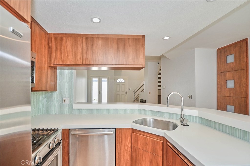 Fabulous townhouse with great location and condition, features a large living room and dining area and kitchen on the middle level with Laminate wood flooring. Fireplace in living room. Kitchen has ample wood cabinetry, Corian countertops, and stainless steel appliances. Wood balcony off living room. Also downstairs is a half bath. Upstairs are two good-sized bedrooms, one with a small balcony. Laundry in garage, attached one car garage and additional parking space with carport very next to the unit. It is close to everything PCC, Caltech, Old Town, the Gold line, Freeway access, and recreational facilities.