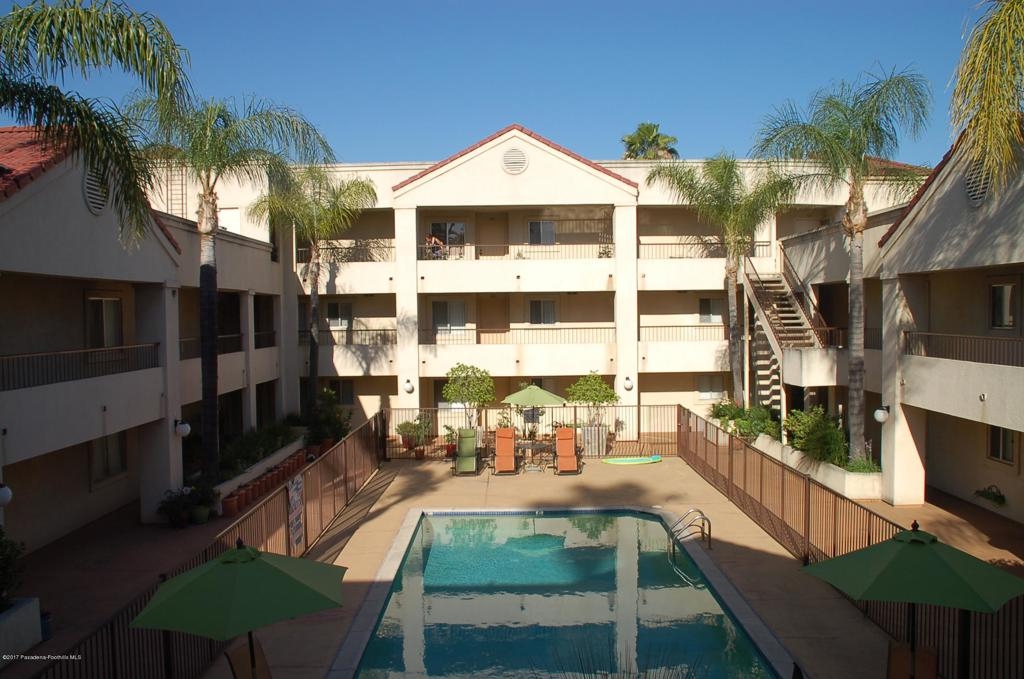 East Pasadena location offers a 2nd floor 1 Bedroom with Mountain views.West facing Kitchen enjoys afternoon sunsets over looks pool below.Dinning area off kitchen. living Room has Glass sliders opening to a East facing Balcony offering Sun rise & Mountain views. Good size bedroom East facing view window. WIC, linen cabinetry area, full bath nice counter space, full length vanity mirror.security Front door entrance. Electric gated subterranean parking. 2 spaces # 3 and # 4. Close to freeway access, PCC.& Transportation.