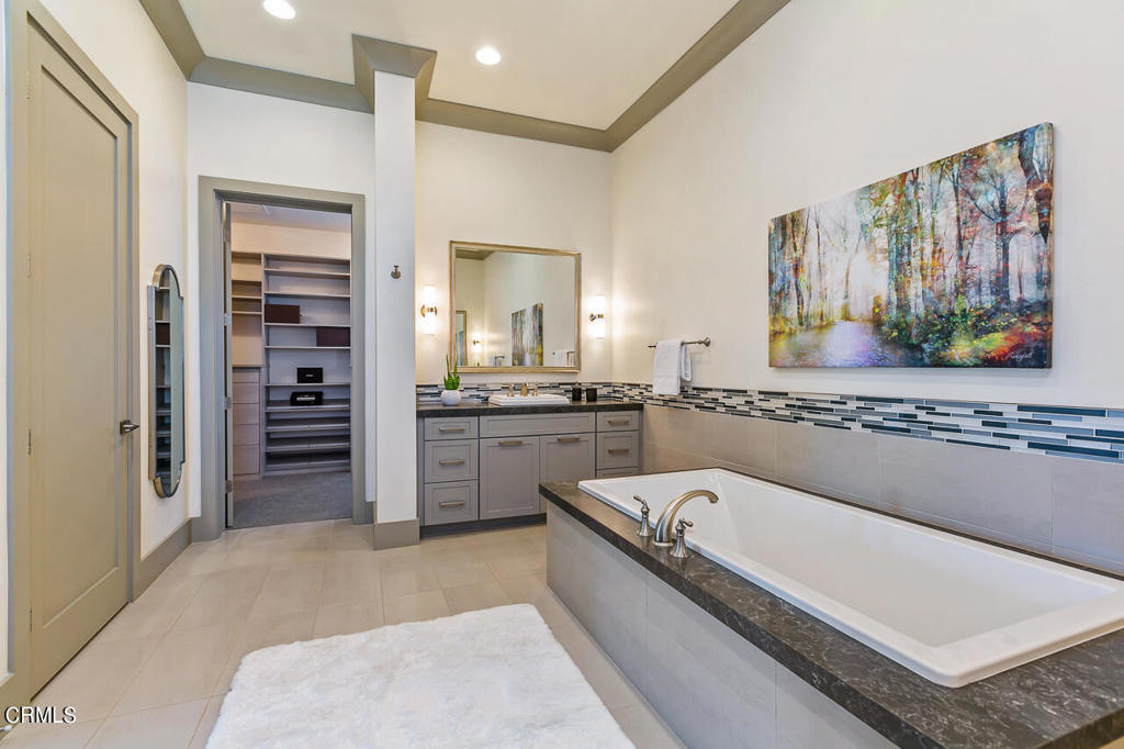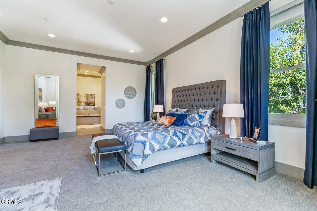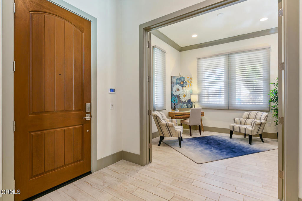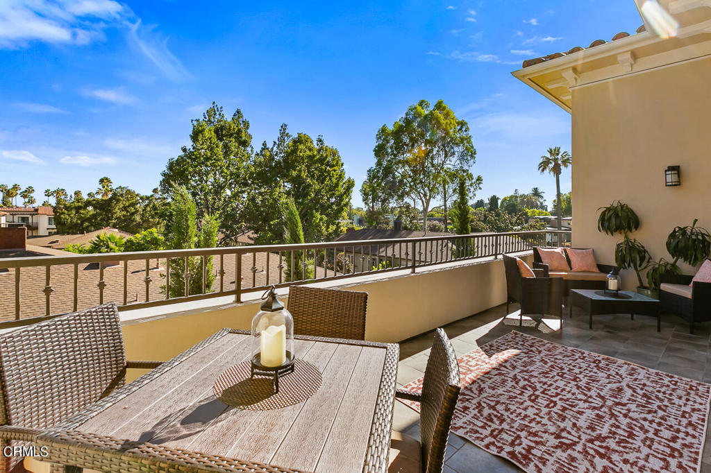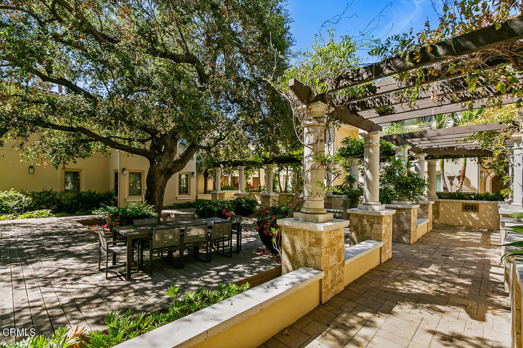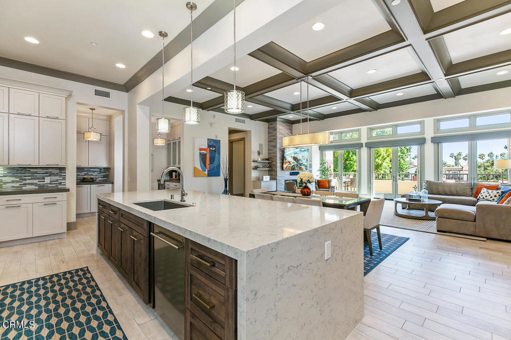 Located at the Ambassador Gardens in the heart of Pasadena, this top floor, corner unit has it all! Soaring ceilings, oversized windows, and an abundance of natural light from the southern exposure make this unit feel warm and inviting throughout. The gracious open floor plan is anchored by a great room with coffered ceilings, stunning modern fireplace, and three sets of french doors leading out to your private patio with treetop views. The gourmet kitchen with waterfall island, oversized pantry and storage open up to countertop seating and dining area, ideal for everyday living or entertaining guests. A generous primary bedroom suite with seating area hosts an expansive bathroom with separate shower and tub, dual vanities and a massive walk-in closet. Two additional bedrooms with ensuite bathrooms both have custom-built closet systems. Completing the unit is an office/den, powder room, laundry room, and smart home system. This unit also has its own private 4-car garage with storage cabinets. Community shares a resort style pool, lush gardens and outdoor dining areas. Property is conveniently close to all that Old Town Pasadena has to offer, including shopping, restaurants, museums, grocery stores and more. Easy access to the 210/134 & 110 freeways are nearby as well.