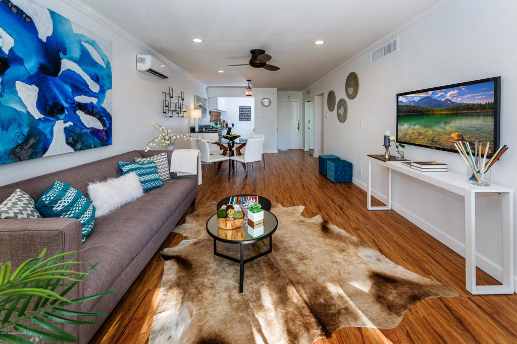 With no adjoining walls, this completely remodeled, ultra chic, 2 bedroom and 2 bathroom top-floor condo is a must-see! It is centrally located to all that Pasadena has to offer. Your new location is walking distance to the Metro, Paseo Colorado, the Playhouse District, South Lake Avenue, Old Town Pasadena, Whole Foods and Trader Joe's. Brand new upgrades include: remodeled kitchen, new cabinetry, new quartz counter tops, new fixtures throughout, a new split-level cooling & heating system, new dual pane balcony slider and brand new flooring. This well-managed HOA offers LOW DUES and amenities including a sparkling pool and spa, community laundry (with newer machines!) and elevator. HOA dues also cover your water, gas, trash and sewer, building maintenance and building insurance.Further list of upgrades: freshly painted, quartz counter tops in the kitchen, marble counter top in the master bathroom, new luxury laminate wide-plank flooring throughout, new sliding glass closet doors, new master bedroom dual pane window, new custom dual pane sliding glass door to the balcony. Brand new split-level A/C and heating system installed. ALL DONE WITH PERMITS.