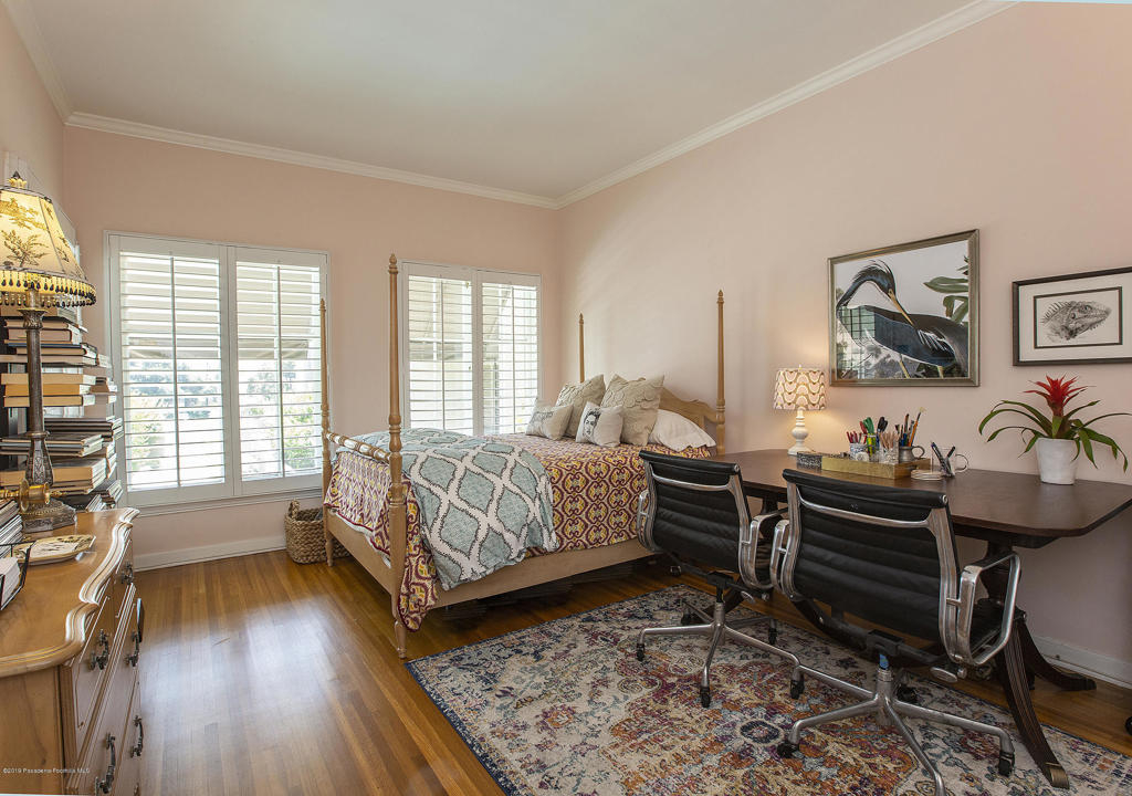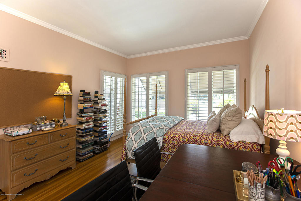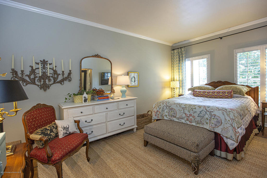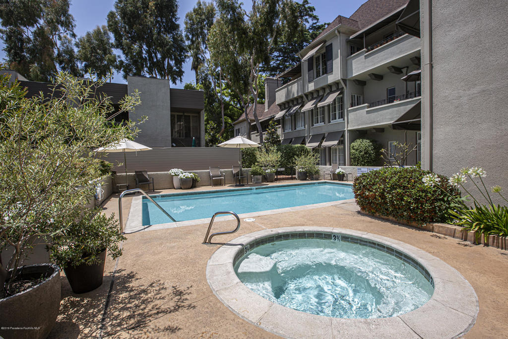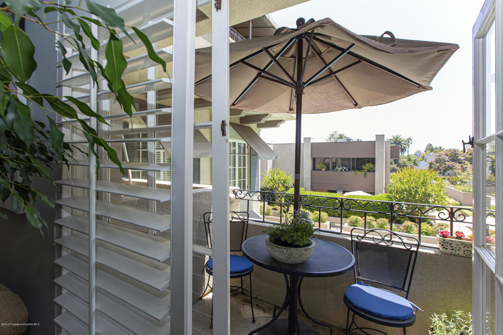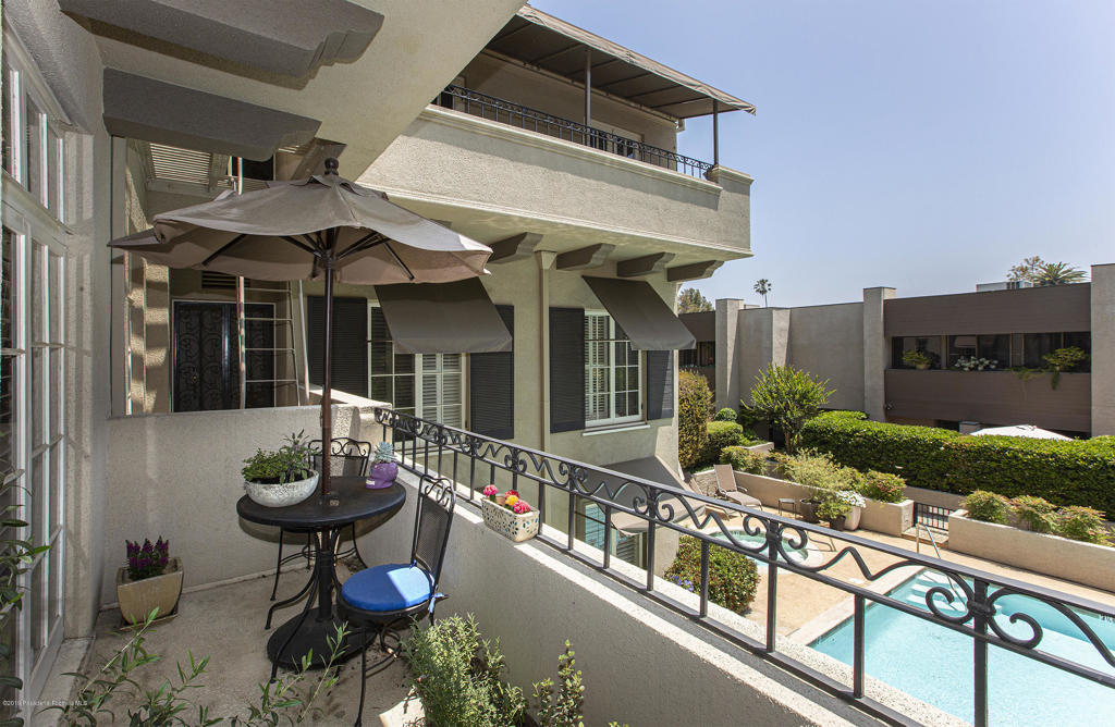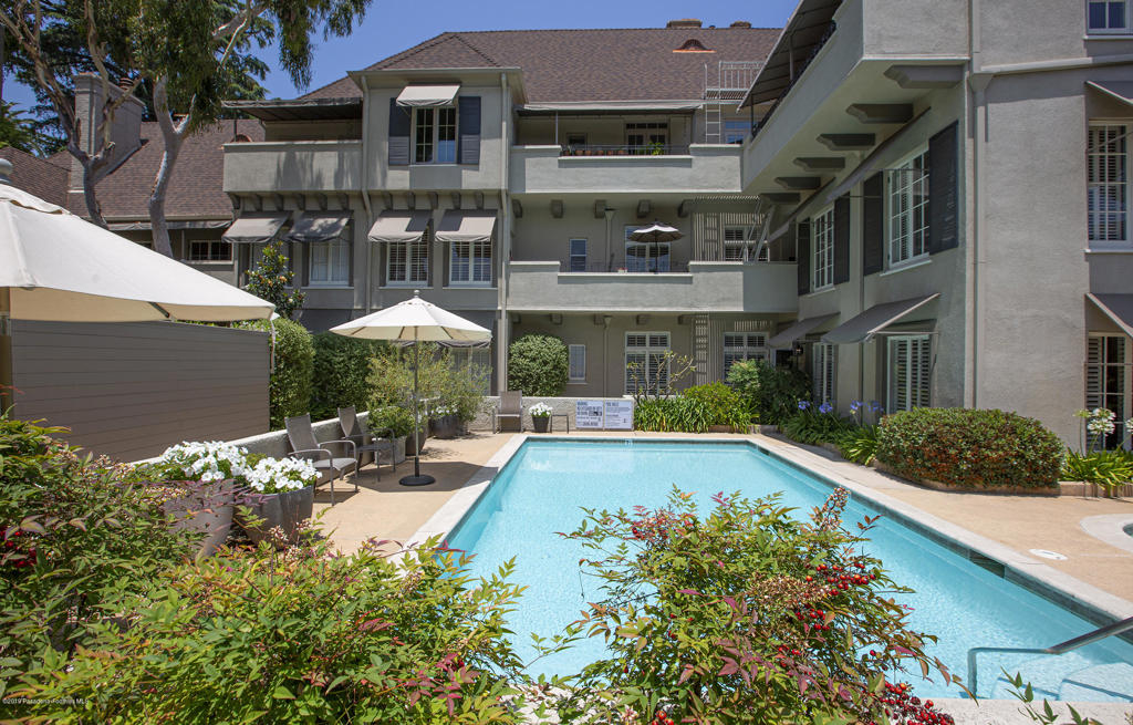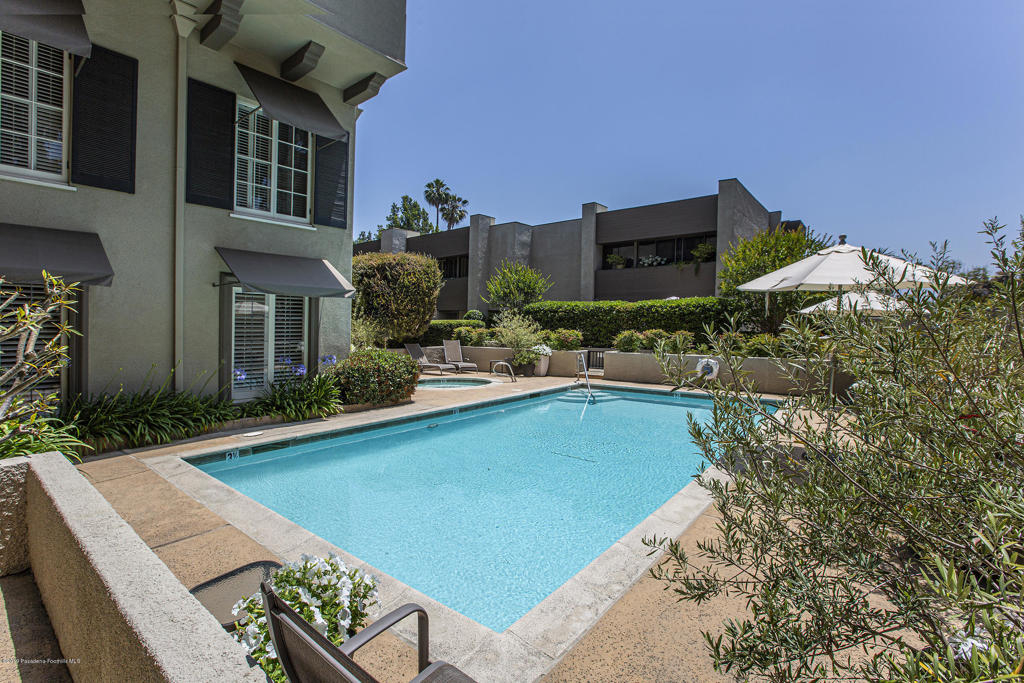 A perfect pied-e-terre on the most elegant and desired street in Pasadena! Feel like you are vacationing in Europe in this lushly landscaped French Normandy building. The elegance of the 9' ceilings, Schonbek lights, Carrera marble fireplace, hardwood flooring and beautiful french doors and windows that afford verdant treetop views and also of the pool and spa, creates a wonderful home to enjoy! Ensuite bedrooms are complete with luxuriously remodeled bathrooms with steam showers, Italian marble tile and Brizo fixtures. The sunny kitchen, with a built-in oven, gas range and stainless steel refrigerator, also accommodates a full size washer and dryer. A kitchen back door takes you to the two storage units and community BBQ and party room. Now you will be conveniently close to the famous Rose Bowl turn and Old Pasadena! Be the fortunate buyer of this gorgeous unit!
