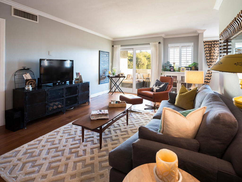 Top floor highly updated condo with views. With one of the best locations in the building, this 1 bedroom, 2 bathroom single level condo is the cream of the crop. The inviting and modern floor plan features an open living room with fireplace that leads to the private balcony with views. The home includes a kitchen with granite counter tops and plenty of storage, a dining room, updated bath for your guests and a large master bedroom with lots of closet space including a separate vanity and walk-in closet. Updates include: Wood Flooring, plantation shutters, crown molding, fully remodeled master bathroom with marble countertops and subway tile, newer carpet in master bedroom, built-in closet organization, and renovated brick fireplace. Very low HOA dues,close proximity to Old Town Pasadena, South Lake Avenue, shopping, restaurants, and 210 freeway access. Come view this gorgeous home, you will not be disappointed!