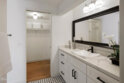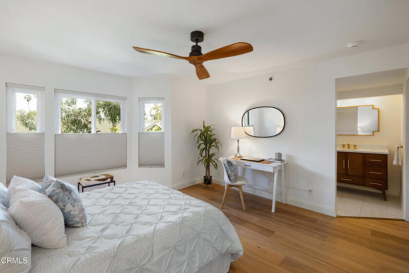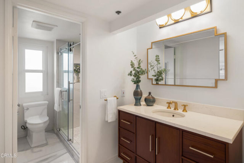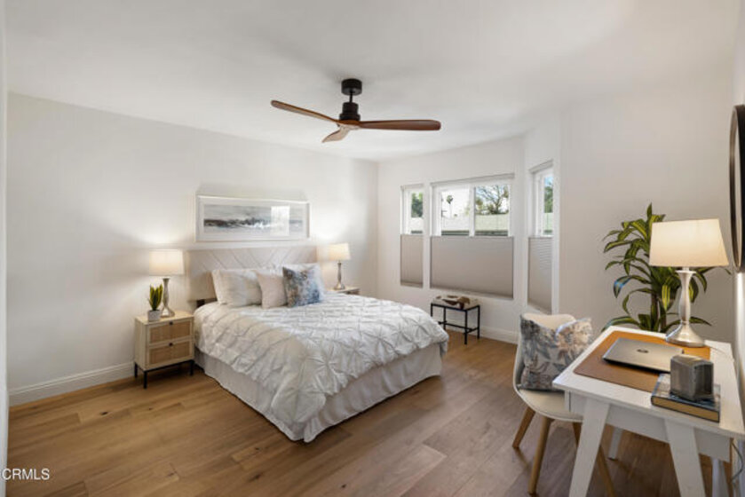 Welcome to The Groves of Pasadena, a gated & secure community offering comfort, privacy, & refined style in a beautifully remodeled two-story townhouse-style residence. Hardwood floors greet you at the entry & flow seamlessly throughout the home, creating warmth & continuity. To the left, the fully updated kitchen blends classic charm with modern functionality, quartz countertops, a farmhouse apron-front sink, designer subway tile backsplash & a five-burner gas range with a sleek low-profile microwave above. A tray ceiling with a custom light fixture adds architectural interest, while wood-louvered shutters frame dual-pane windows overlooking the courtyard. A French door refrigerator with a bottom freezer completes this thoughtfully curated space. To the right of the entry, a stylish guest powder room with a pedestal sink sits alongside a dedicated laundry room featuring a side-by-side washer & dryer. Just beyond, the dining area opens to the inviting living room, where recessed lighting, dual-pane windows & a gas corner fireplace create an ideal gathering space. A sliding glass door leads to a generously sized private patio, perfect for outdoor dining, lounging & entertaining, complete with its own storage closet. Upstairs, hardwood flooring continues across the landing, where linen cabinetry provides added storage between the two ensuite bedrooms. The first suite features dual-pane windows, wood-louvered shutters, a custom ceiling fan with solid wood blades & a spacious walk-in closet. The attached bathroom offers custom tile flooring, a stone-topped vanity with soft-close drawers, a private water closet & a deep soaking tub & shower combination surrounded by designer subway tile extending to the ceiling. The second bedroom mirrors the same level of thoughtful design with matching hardwood floors, a coordinating custom ceiling fan, dual-pane windows & custom shades that balance privacy with natural light. Its ensuite bathroom includes a stone-topped vanity, private toilet room & an oversized shower with custom chevron tile detailing & sliding glass doors. Residents enjoy elevator access to assigned subterranean parking, a communal barbecue area & close proximity to the Shops at Lake Avenue, popular dining destinations & convenient Metro access offering flexible commuting options & easy access to all that Pasadena has to offer. A turnkey opportunity combining security, style & an exceptional location in one of Pasadena's desirable communities.
