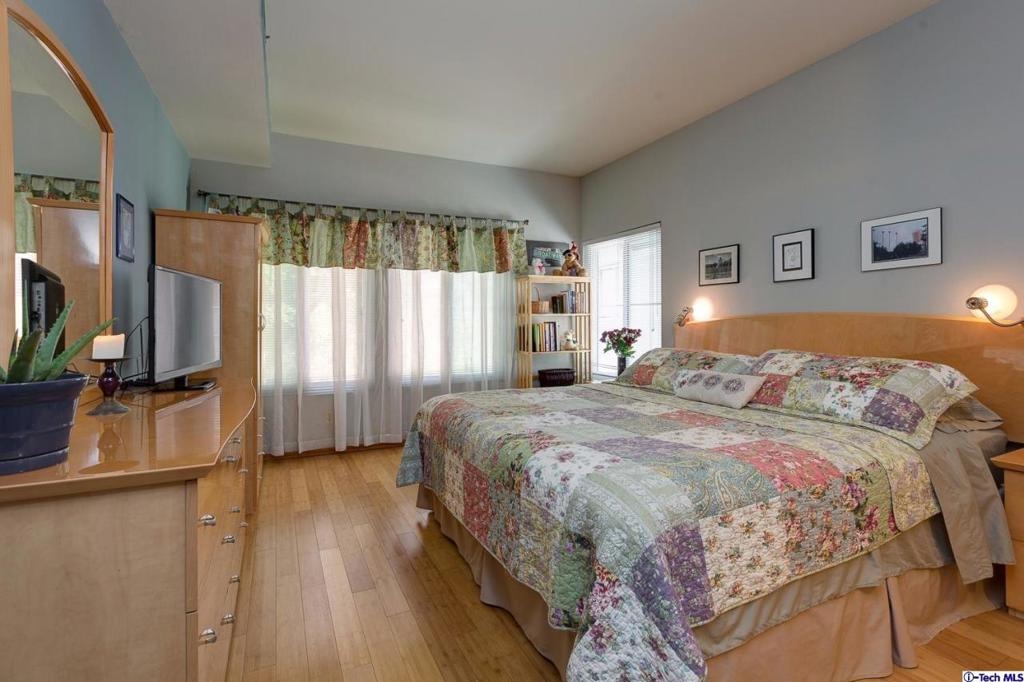 This 2 bedroom,2 bathroom condo in a very desirable complex in Pasadena has been lovingly remodeled.Through the front door one is struck by the glistening bamboo wood floors that run throughout the home of the open floor plan.This end unit home has only one shared wall & has natural light which flows through an abundance of double pane windows that look out upon the trees in the courtyard & the community spa & patio area in the other direction.The remodeled kitchen inspires everyone to be a chef w/ granite counter tops,new stainless steel appliances,& a lovely new light fixture.The kitchen opens up to the dining room & living room.A focal point of the living room is the gas & wood burning fireplace whose exterior has been remodeled w/ granite.A custom sliding door opens to a private patio for relaxing outside.One of the highlights is that both bedrooms are suites w/ attached bathrooms.The first suite is highlighted by the bamboo floors,views of the courtyard & an attached remodeled bathroom w/ granite counter tops,a new mirror & light fixture & the closet w/ a stackable washer/dryer for ease of doing laundry.The larger bedroom suite is spacious w/ abundance of windows w/ attached remodeled bathroom including 2 sinks,granite counter tops & shower/tub.