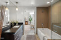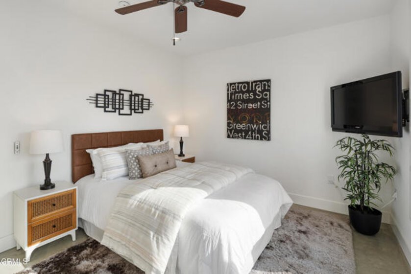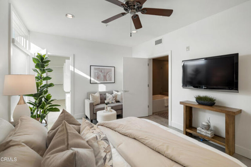 Experience sophisticated urban living in this stunning top-floor luxury condo at The Burton, one of Pasadena's most sought-after contemporary communities. As the largest floor plan in the building with only one shared wall, this residence offers an added sense of privacy and exclusivity rarely found in condo living. Designed for modern comfort and style, the open-concept layout allows the living, dining, and kitchen spaces to flow seamlessly together -- ideal for entertaining or relaxed everyday living. Polished concrete floors, recessed lighting, and floor-to-ceiling windows infuse the home with a bright, airy ambiance. The sleek kitchen features granite countertops, stainless steel Frigidaire Gallery appliances -- including a gas range, microwave, side-by-side refrigerator, and dishwasher -- along with a discreetly hidden laundry area tucked behind cabinetry for a clean, streamlined look. The living room opens to a private balcony with expansive eastern views that stretch across the city and out to the mountains -- a perfect spot for morning coffee or unwinding at the end of the day. Smart home upgrades, such as Philips Hue lighting and remote-controlled window blinds, add thoughtful convenience to the everyday experience. Down the hallway, two spacious bedrooms offer oversized windows, ceiling fans, and walk-in closets. The guest bedroom is located near a stylish full bathroom with a tub and shower combination and a sleek single-sink vanity. The primary suite is its own peaceful retreat, featuring a deep walk-in closet and a spa-inspired bathroom with stone countertops, a soaking tub, and a glass-enclosed shower. Residents enjoy oversized parking spaces located conveniently near the elevator, creating a smooth day-to-day arrival experience. Located in the heart of Pasadena, this exceptional home places destinations such as Lake Avenue shopping and dining, Old Town Pasadena, The Paseo, and the Pasadena Civic Auditorium close at hand. Easy access to the Metro Gold Line provides direct connectivity to downtown Los Angeles, and the renowned Rose Parade route is approximately one and a half blocks away -- placing local tradition and entertainment within effortless reach. With its sophisticated finishes, smart technology, sweeping views, and prized location, this top-floor residence offers elevated comfort and elegant city living at its finest.