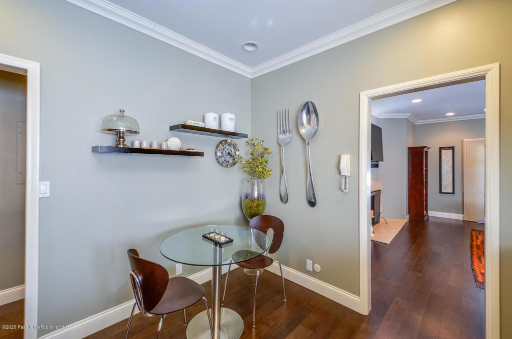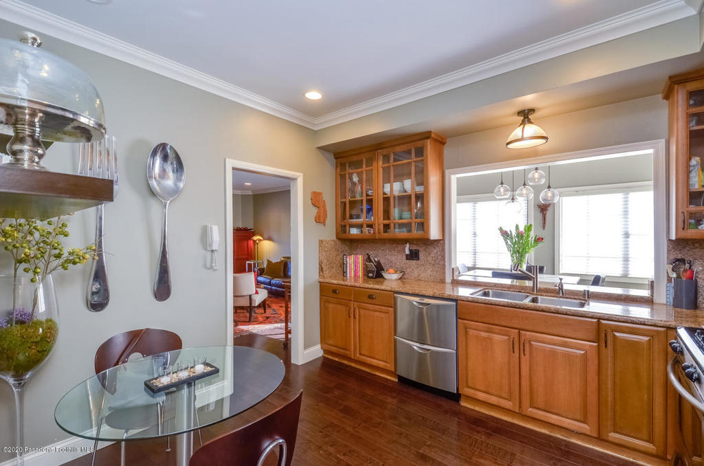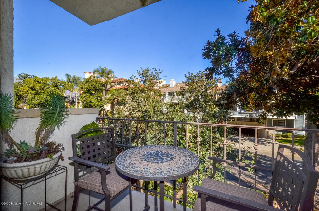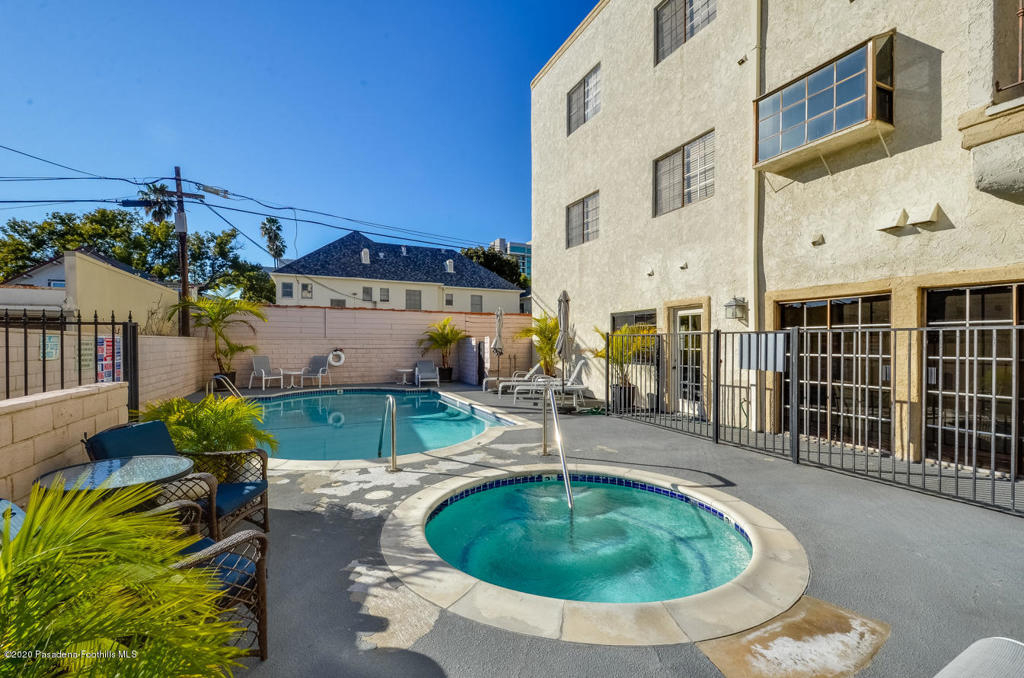 Located in a small complex, in a central urban location on a tree-lined street is this elegantly remodeled condo. East facing exposure and two balconies provide a light and airy feeling. Truly move in condition! Some of its stunning features include gorgeous hardwood floors, high ceilings, crown molding, travertine fireplace, built-in cabinetry, beautiful light fixtures and recessed lighting. The large kitchen offers granite counters, stainless steel appliances, hardwood floors and an eating area. The dining area offers a granite breakfast bar with pass-through to the kitchen. Both baths have been remodeled with elegant fixtures and finishes. The master suite offers a large walk-in closet customized for storage needs. A stackable washer and dryer are inside the unit. Well maintained complex offers: pool, spa, sauna, gym, rec room, elevator and gated subterranean parking with 2 tandem spaces. Urban lifestyle with close proximity to Playhouse District, Old Town Pasadena, South Lake Shopping District, Gold Line, Cal Tech and PCC. Earthquake insurance included in HOA dues.