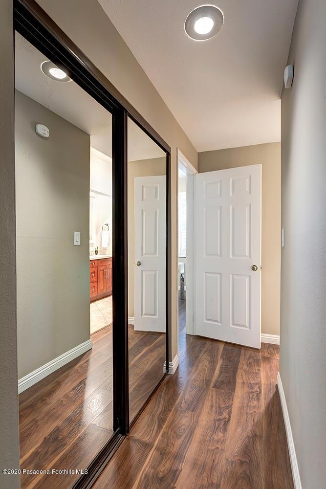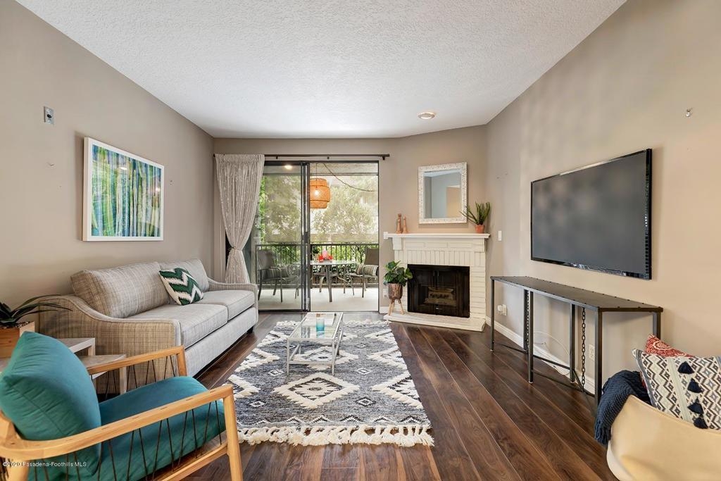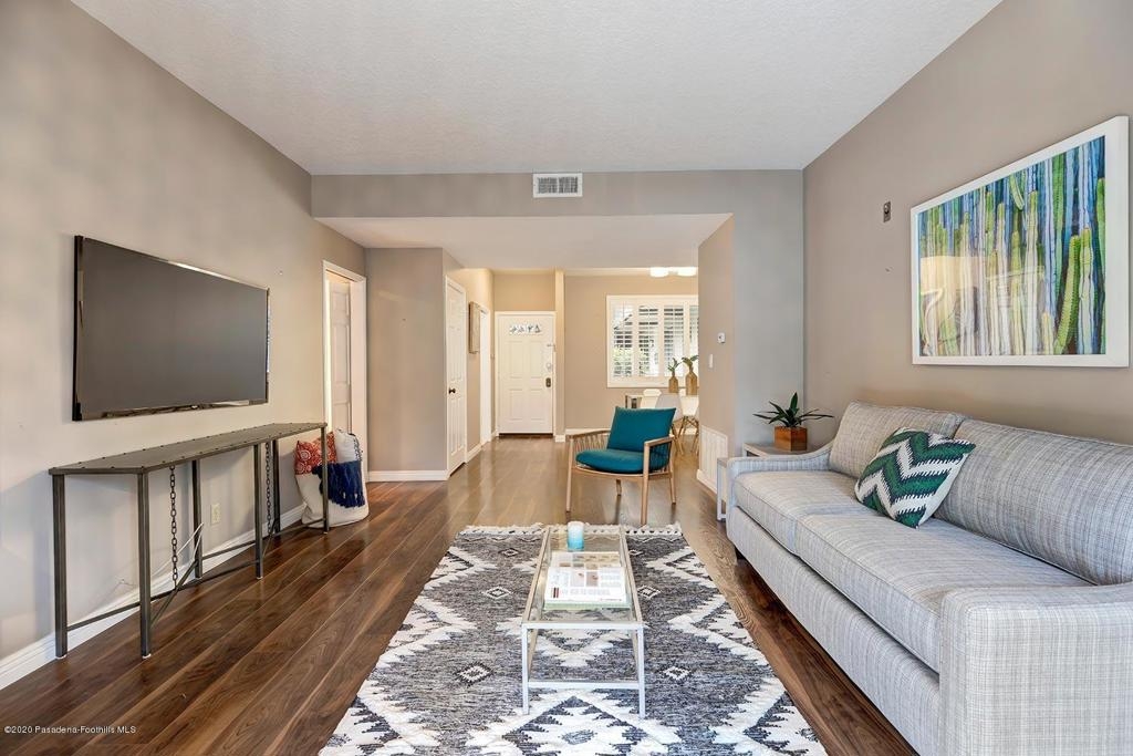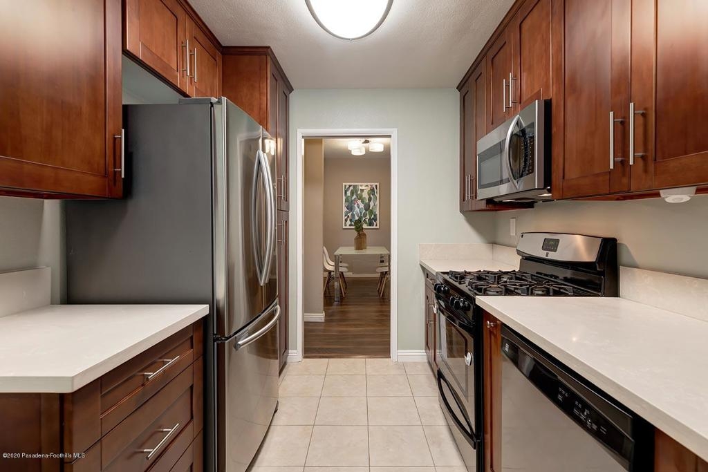 Completely remodeled first floor, corner residence tucked away from the street likely has the most outdoor space in this desirable community in one of Pasadena's most convenient locations. This open floor plan in Cordova Park Villas with bedrooms on opposite sides, boasts a beautifully remodeled eat-in kitchen with rich wood custom cabinetry, cream colored quartz counters and stainless appliances. The large dining area opens to the spacious living room with brick fireplace. The huge wrap-around patio has two connected but separate areas with access from the master suite and living room. The master suite with walk-in closet has a tremendous bath with dual sinks, quartz counters, coffee colored cabinetry, jacuzzi tub and separate shower. Interior laundry, additional walk-in storage locker in garage, pool, spa, 17-guest parking spaces, gym and enormous recreation room with full kitchen is perfect for hosting any occasion. Close to Gold Line, El Paseo Shopping Center, Old Town Pasadena, Rose Bowl and major freeways make this an incredible value.
