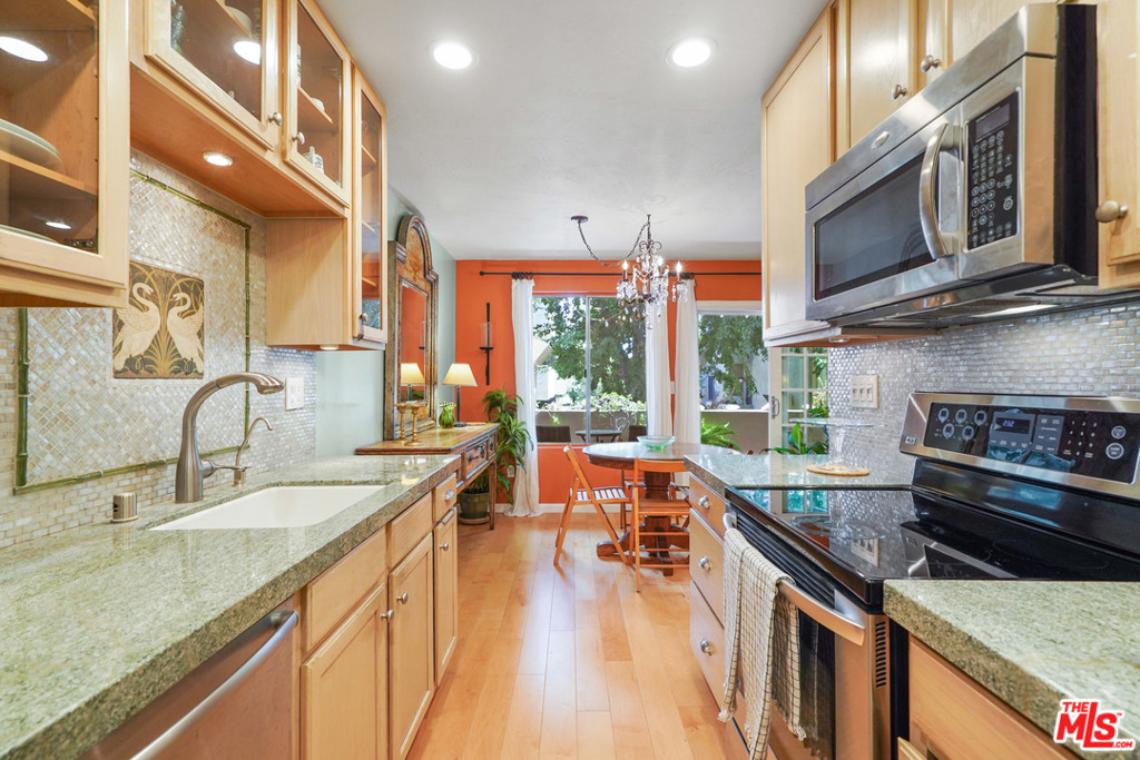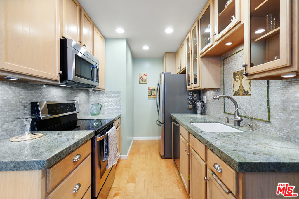 Bright and quiet unit in prime Pasadena location. Enter the spacious living room with dining area that moves into the modern kitchen complete with stainless steel appliances, costa esmeralda granite countertops, and recycled glass backsplash. Sliding-glass doors open up to a private patio overlooking greenery. Beautiful maple hardwood floors run throughout this cozy home. Right off the large sunny bedroom is a nice size walk-in closet. The bathroom displays quartz vanity top, brass fixtures and extra depth soaking tub. Convenient access to the updated grounds with mature trees, water sculptures, a BBQ area with outdoor tables, Jacuzzi and sauna as well as a pool for hot summer days. Subterranean parking spot and laundry on site. Here you will find Trader Joes, Real Food Daily, and Sugarfish to name a few right at your doorstep, with Cal Tech just blocks away. Come and enjoy everything Pasadena has to offer!