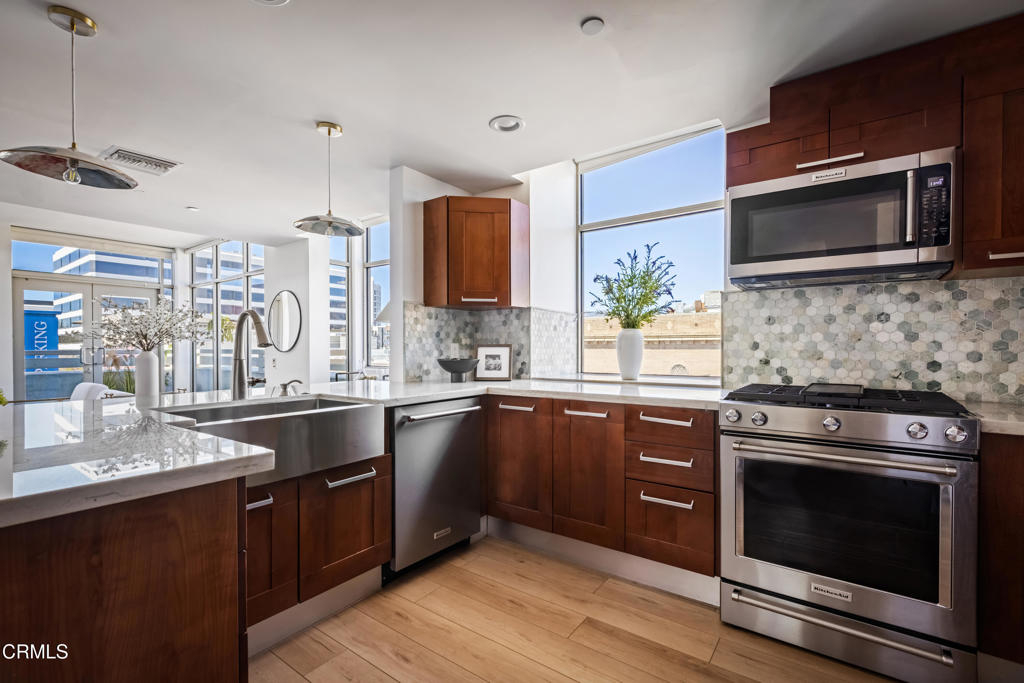 Located on the top floor, this corner two level residence in the sought-after Boston Centennial Building is wrapped in floor to ceiling glass, filled with natural light, and framed by sweeping mountain views in the heart of Old Town Pasadena. The main level is designed for entertaining and features a private balcony, a redesigned kitchen with quartz countertops and stainless steel appliances, and a convenient powder bath for guests. Upstairs, two private bedroom suites offer ideal separation and comfort. Additional highlights include a dedicated EV charger, secured entry, rooftop patio access, and two assigned subterranean parking spaces, with one accommodated by a private car lift system. Just one block from Colorado Blvd., this condo is ideally located near dining, shopping, Metro, ArtCenter, Rose Parade route, and all that Pasadena has to offer.