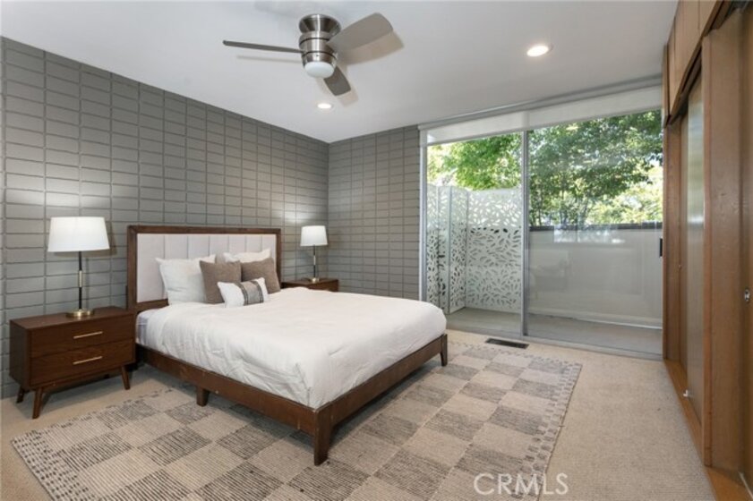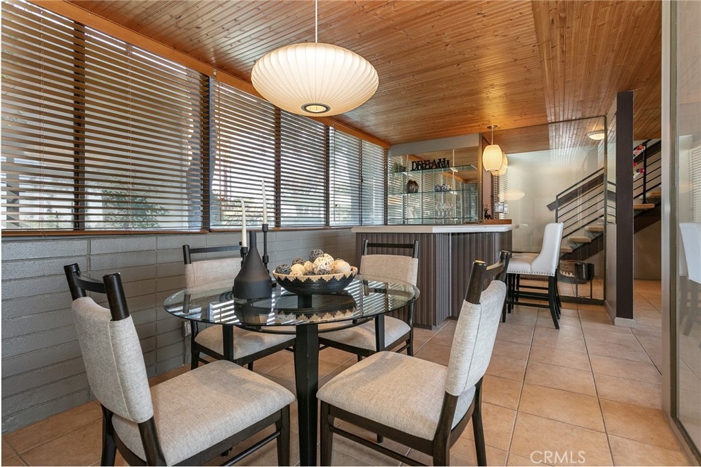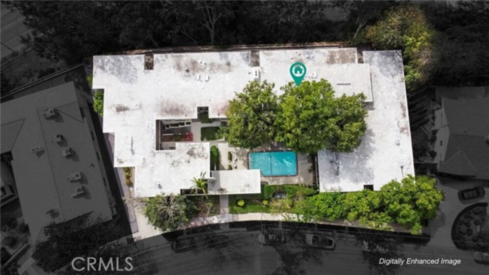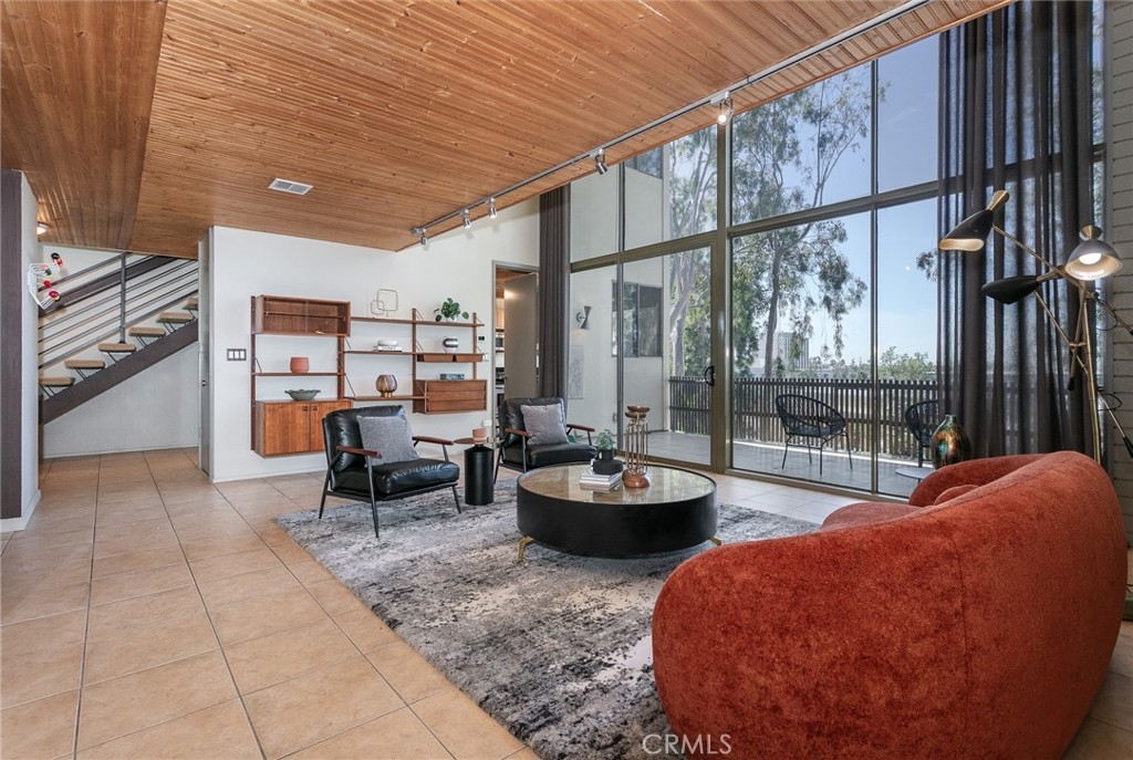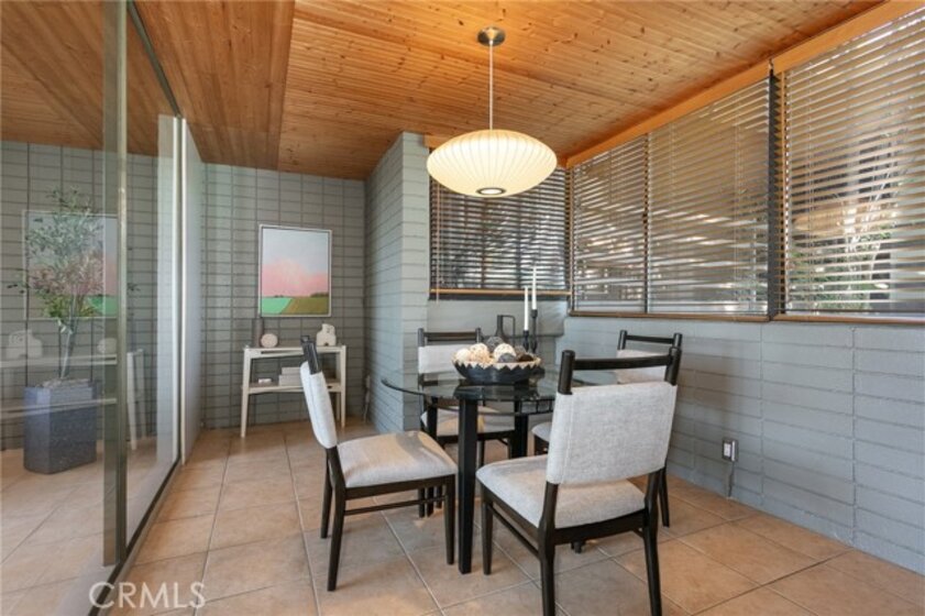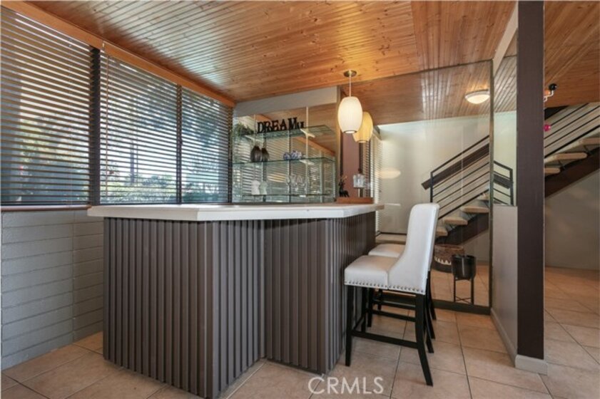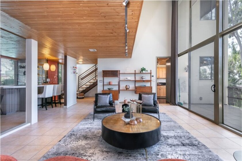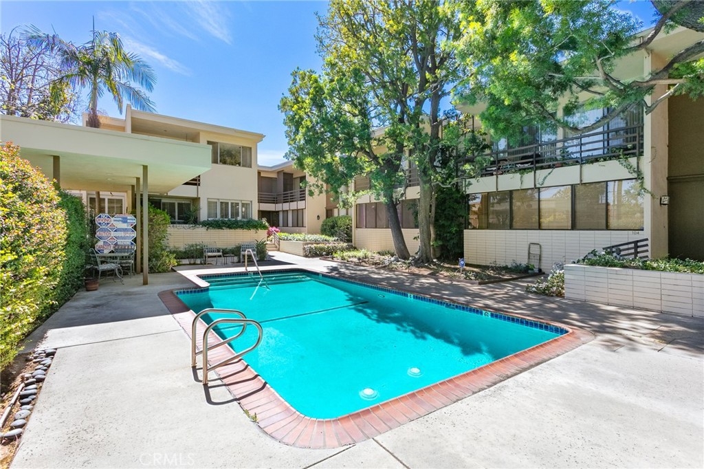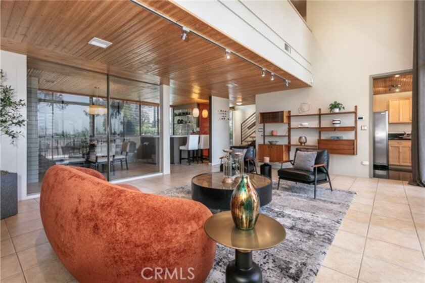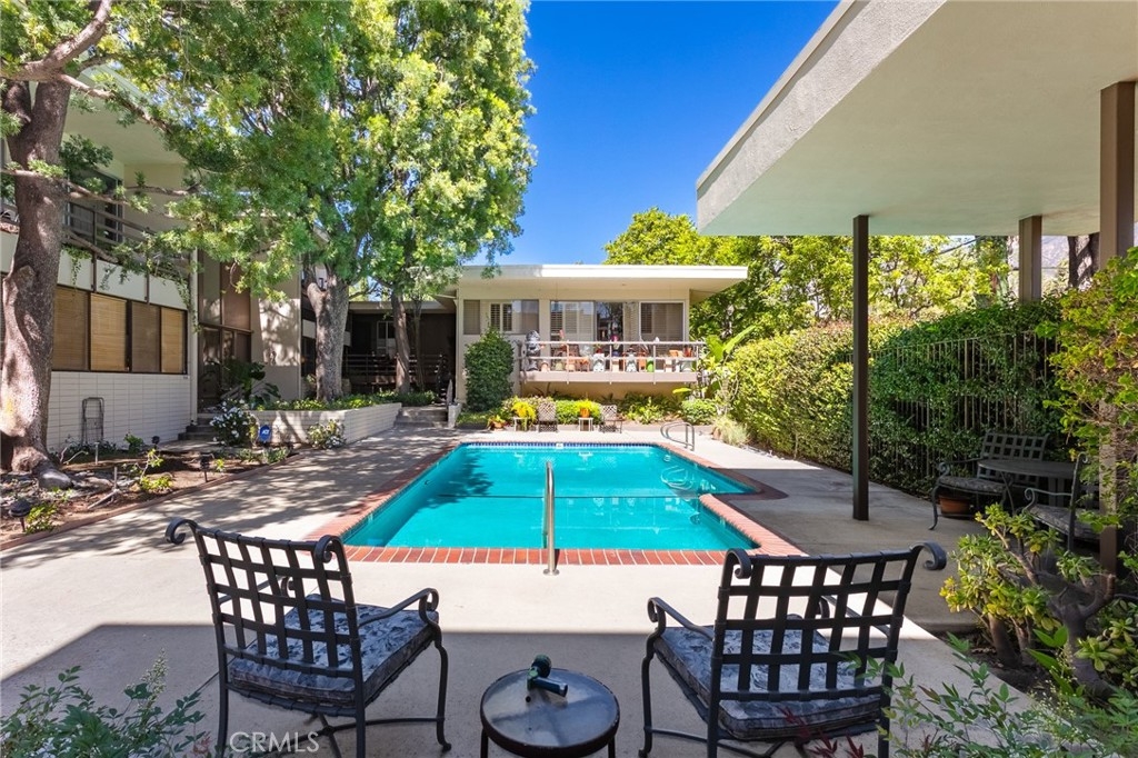This townhome is located in the desirable Lower Hastings Ranch neighborhood of Pasadena. Close to dining, shopping, parks, golf courses, Old Town Pasadena, the Rose Bowl, PCC, Caltech, the 210 Freeway, and Metro A Line. Situated in a charming 10-unit community with mature landscaping and a central courtyard pool, this home offers a peaceful, well-maintained setting. Interior highlights include soaring vaulted ceilings, wood ceilings, concrete block accent walls, central A/C, recessed lighting, integrated laundry, and tile and carpet flooring. Expansive windows bring in abundant natural light, complemented by over 200 sq ft of combined balcony space. The living room features double-height ceilings and floor-to-ceiling windows, with sliding glass doors opening to a large balcony with city views. The dining area includes a built-in bar, ideal for entertaining. The kitchen offers granite countertops, stainless steel appliances, and a functional layout with integrated laundry. Upstairs features two bedrooms and a full bathroom. Both bedrooms feature ceiling fans, along with carpet flooring and sliding wood closets. The primary bedroom overlooks the living area below, while the second bedroom offers greenery views and access to a shared balcony. The full bathroom is updated with a modern vanity, quartz countertop, and a tile surround frameless glass shower room. Don’t miss this opportunity to own a light-filled home with architectural character and a prime location.