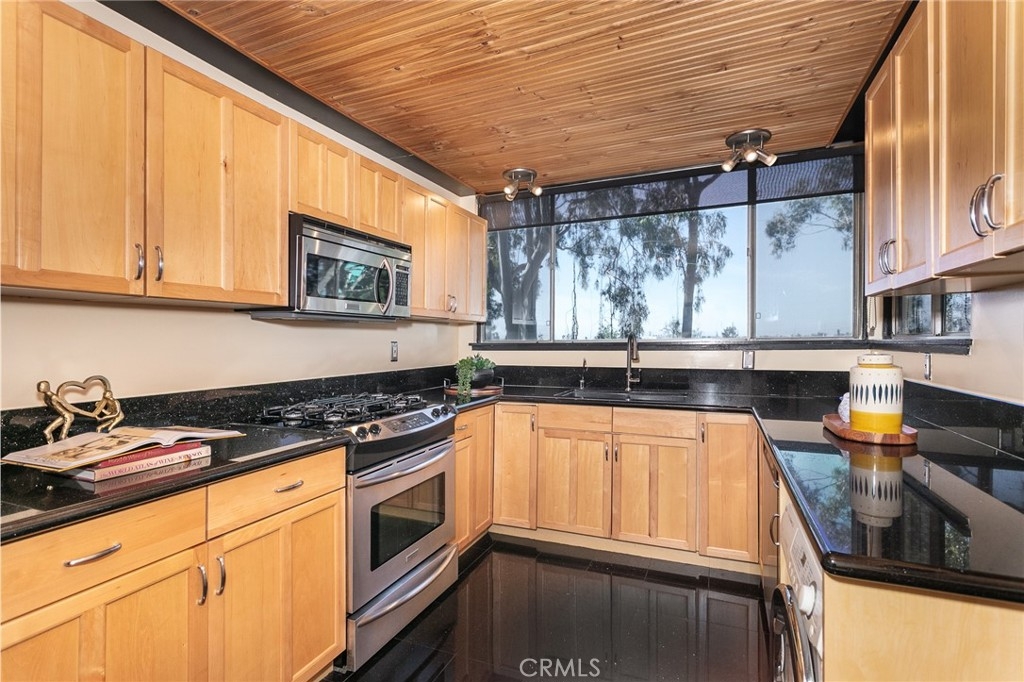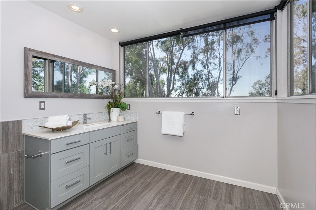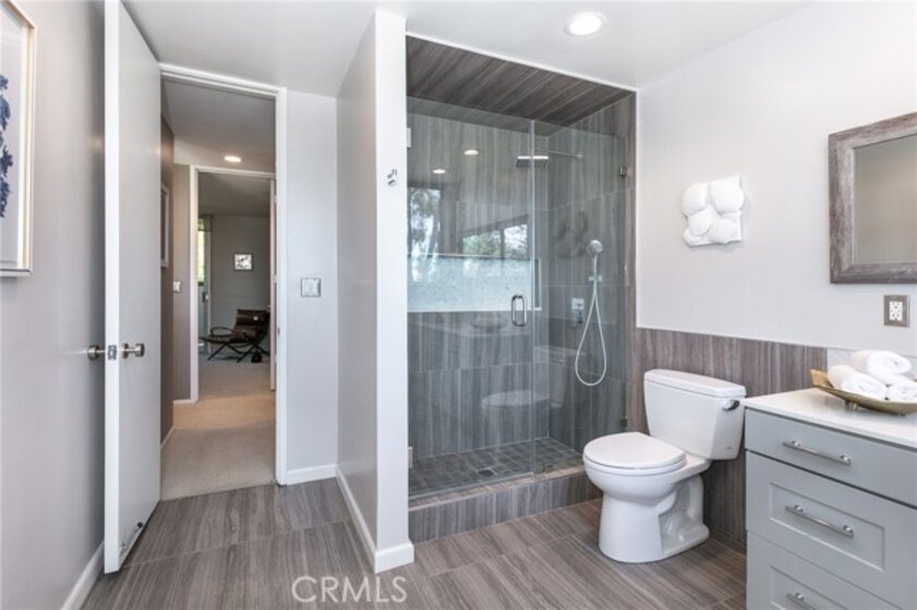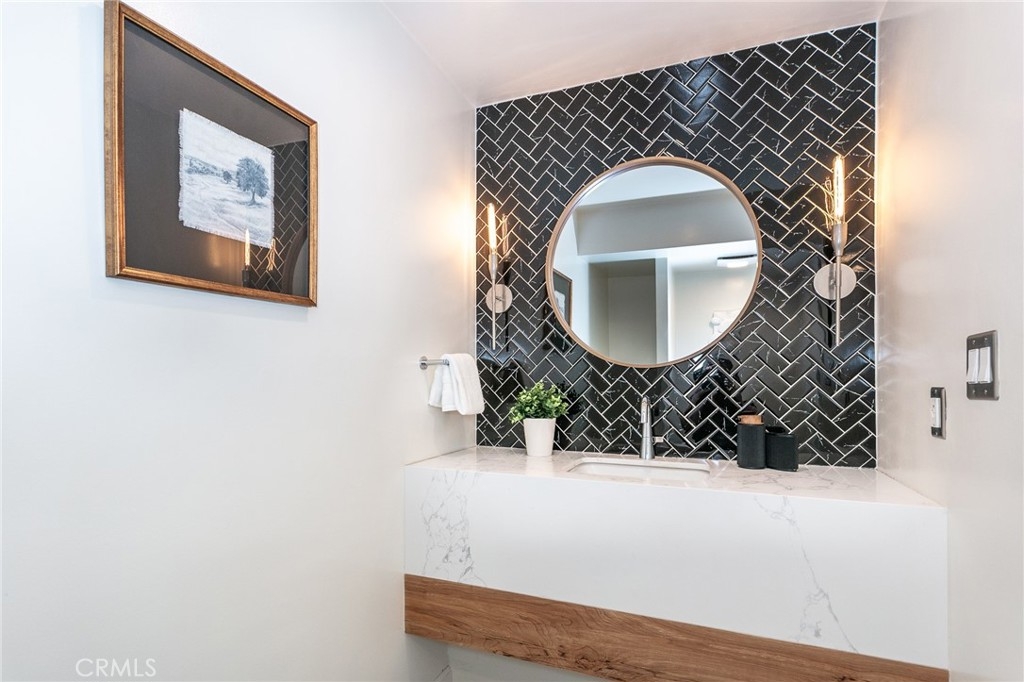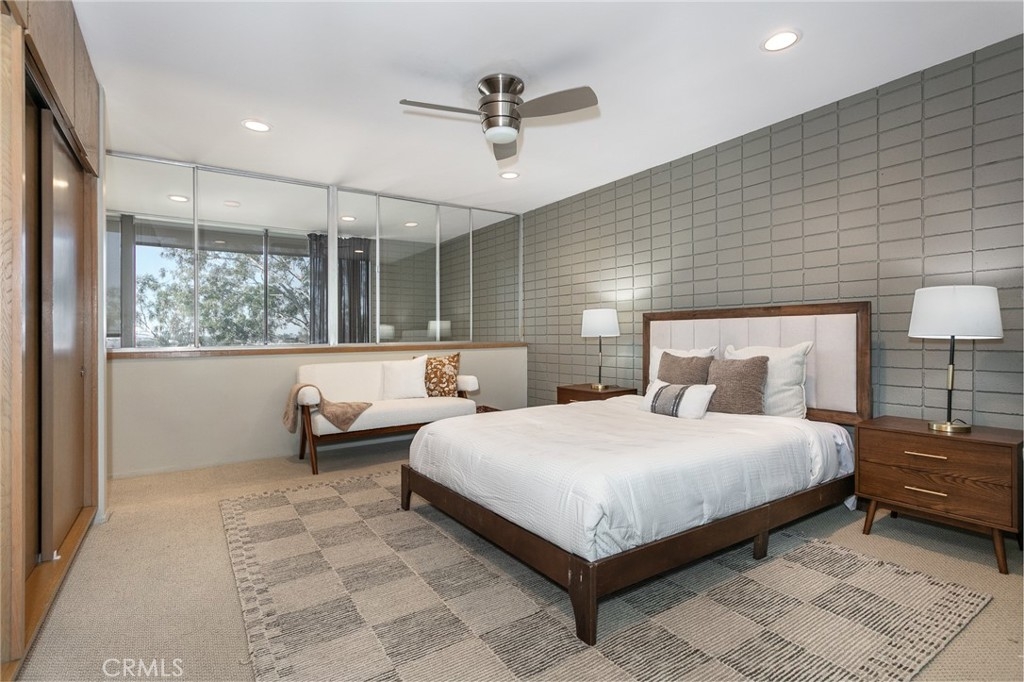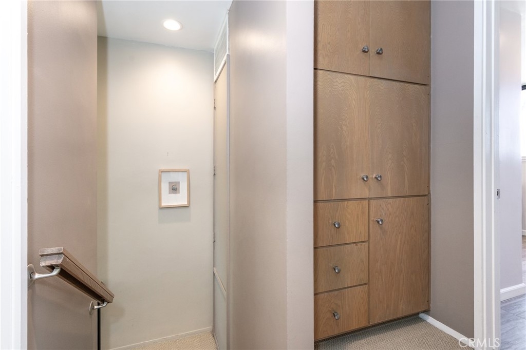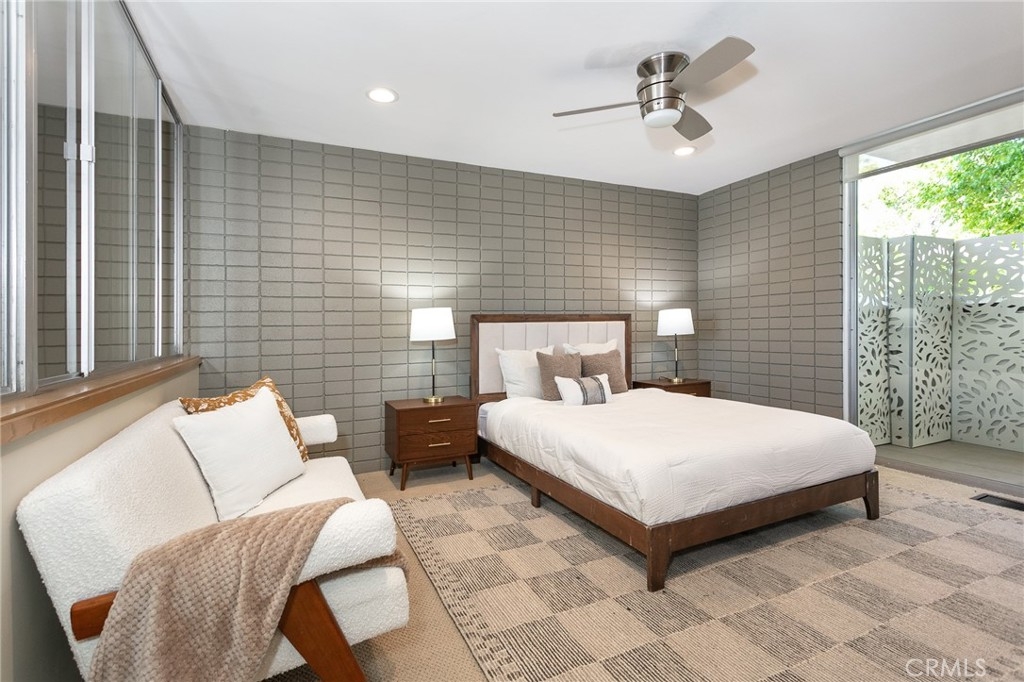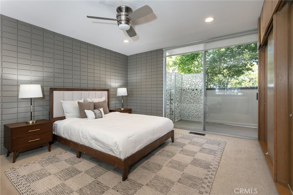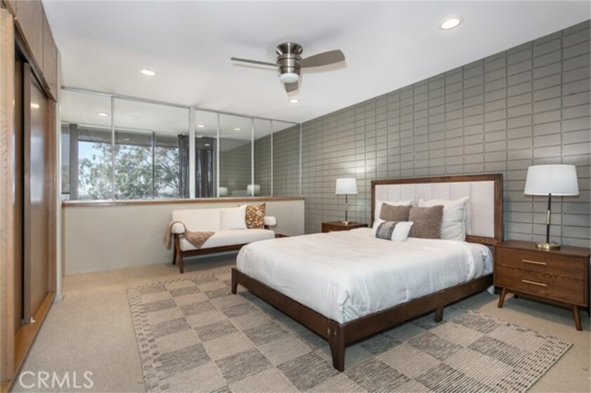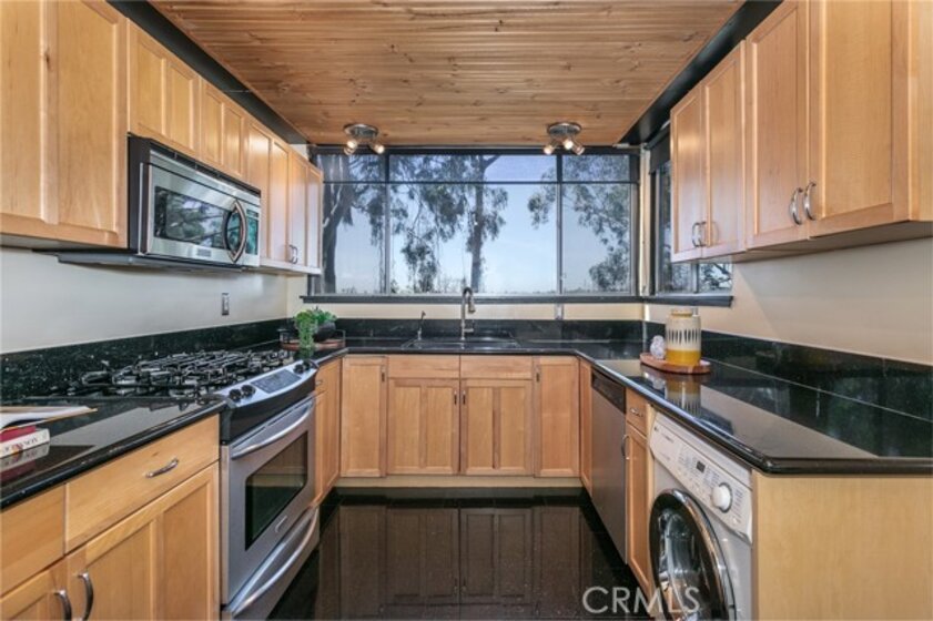 This townhome is located in the desirable Lower Hastings Ranch neighborhood of Pasadena. Close to dining, shopping, parks, golf courses, Old Town Pasadena, the Rose Bowl, PCC, Caltech, the 210 Freeway, and Metro A Line. Situated in a charming 10-unit community with mature landscaping and a central courtyard pool, this home offers a peaceful, well-maintained setting. Interior highlights include soaring vaulted ceilings, wood ceilings, concrete block accent walls, central A/C, recessed lighting, integrated laundry, and tile and carpet flooring. Expansive windows bring in abundant natural light, complemented by over 200 sq ft of combined balcony space. The living room features double-height ceilings and floor-to-ceiling windows, with sliding glass doors opening to a large balcony with city views. The dining area includes a built-in bar, ideal for entertaining. The kitchen offers granite countertops, stainless steel appliances, and a functional layout with integrated laundry. Upstairs features two bedrooms and a full bathroom. Both bedrooms feature ceiling fans, along with carpet flooring and sliding wood closets. The primary bedroom overlooks the living area below, while the second bedroom offers greenery views and access to a shared balcony. The full bathroom is updated with a modern vanity, quartz countertop, and a tile surround frameless glass shower room. Don’t miss this opportunity to own a light-filled home with architectural character and a prime location.
