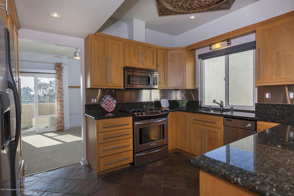Situated on a tranquil, tree-lined street, this gorgeous condominium has been meticulously updated and shows great pride of ownership. The bright and inviting living area includes a soaring ceiling, skylights, recessed lighting, cozy fireplace, and a pair of sliding doors opening to the large balcony, where inspiring treetop and mountain views can be enjoyed. The spacious dining room, with built-in shelves and custom wired Bose speakers, flows effortlessly into the gourmet kitchen, which boasts slate tile flooring, granite countertops, stainless steel appliances, and updated cabinetry. The laundry closet, with stackable washer and dryer, is conveniently attached to the kitchen. Next to the kitchen is a cozy den with a built-in entertainment cabinet, perfect for entertaining or unwinding after a long day! Down the hall, find the spacious master bedroom with recessed lighting, 2 large closets, and a pair of sliding doors leading to the balcony. The recently updated master en-suite bathroom includes a large double sink vanity and overhead skylight, offering plentiful natural lighting. A spacious second bedroom and bathroom are conveniently located across the hallway. Ideally perched on the top floor, this condominium provides a unique blend of convenience and privacy by being steps away from the elevator and having no shared walls. Dual pane windows are also featured throughout the entire unit. The meticulously maintained complex features gated entry with security code, underground parking with two reserved spaces for the unit, and a charming courtyard with well-manicured trees, lush green shrubs, and a sparkling water fountain. Additional complex updates include newer plumbing pipes and roof. Just minutes from Old Town Pasadena, the Rose Bowl, Caltech, PCC, the Shops on Lake, metro station and the 210 freeway, this stunning home is a true gem!