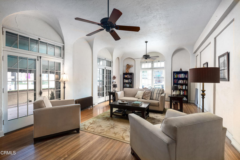 Own a piece of history! The Barcelona. This 1922 Pasadena legend is perfect for the discriminating buyer looking to live in the Pasadena Playhouse Historic District. Through the original lobby and past the front desk, one finds the original elevator, (although newly updated mechanically), that leads to this top floor one bedroom corner unit. With commanding views to the south and east, the homes feels light and bright throughout the day. In addition to the corner living room, character kitchen, full bath, and large bedroom with ample closet, there is a separate small office area just off the main room. There is an additional storage space and a large laundry area in the basement. The Barcelona is a Mill's Act building, and its location is convenient to local shopping, theaters, and the Metro Gold Line. A unique and romantic unit ready for its next steward.